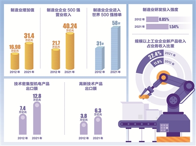 据统计,2012年至2021年,我国制造业增加值从16.98万亿元增长到31.4万亿元,占全球比重从22.5%提高到近30%。在世界500种主要工业产品中,我国有四成以上产品产量位居世界第一。中国制造业企业500强营业收入从2012年的21.7万亿元增长到2021年的40.24万亿元,有58家制造业企业进入2021年世界500强榜单,比2012年增加27家。