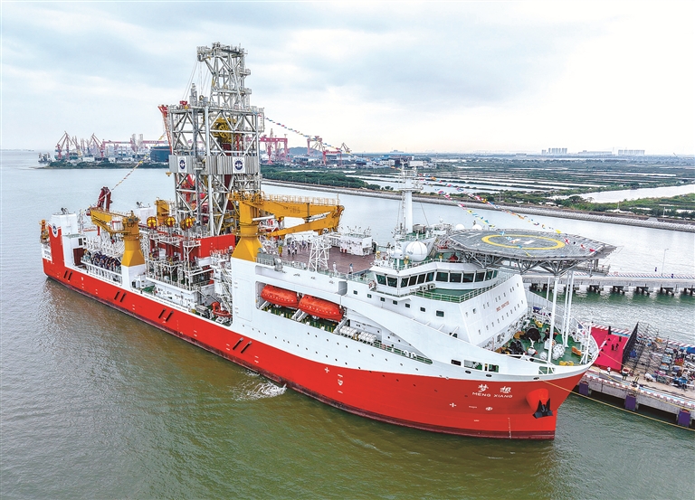 “十四五”时期,我国持续加强关键核心技术攻关和成果应用,加快高端装备、先进制造等领域关键技术攻关,推动传统产业向高端化、智能化、绿色化转型。图为拥有最大11000米的钻深能力、我国自主设计建造的首艘大洋钻探船“梦想”号,该船于“十四五”时期正式入列(资料图片)。新华社记者 刘大伟 摄